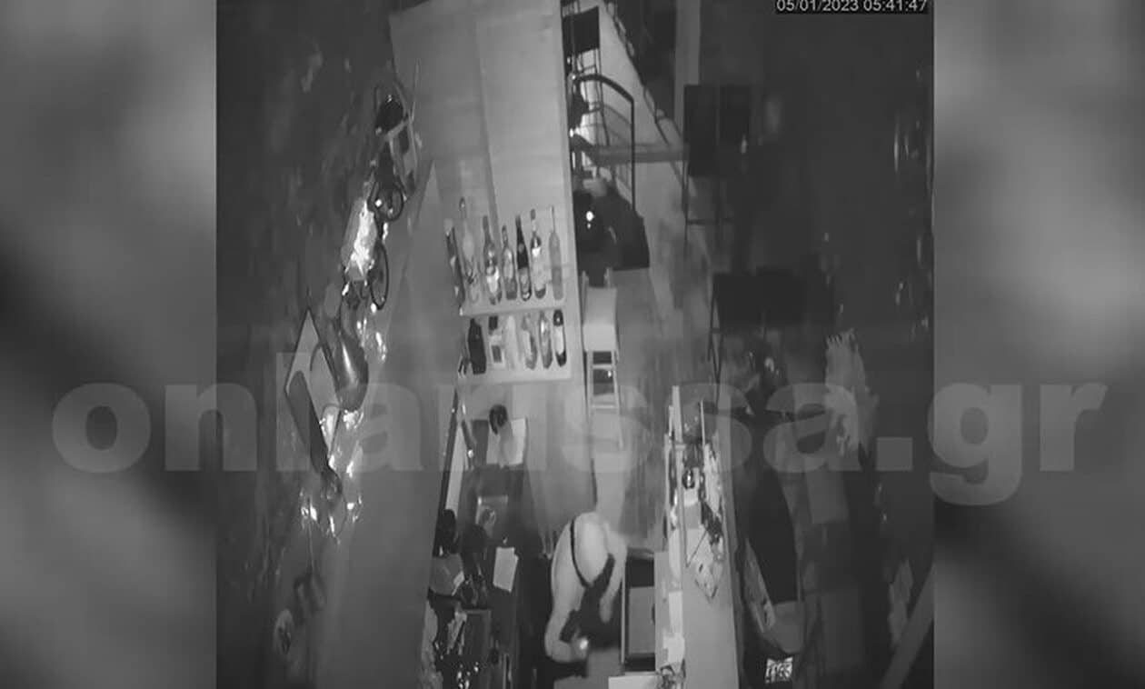 Σύμφωνα με το onlarissa.gr Έχοντας στο χέρι έναν μικρό φακό και φορώντας λευκό φούτερ με κουκούλα, ο δράστης έψαξε επιμελώς τα ντουλάπια του καταστήματος.