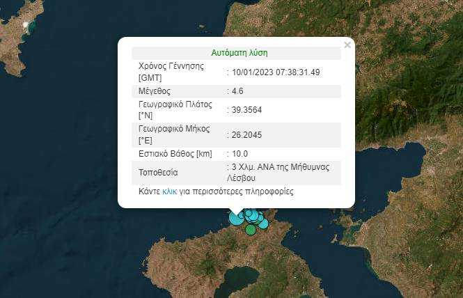 Σεισμός μεγέθους 4,8 βαθμών της κλίμακας Ρίχτερ, σημειώθηκε το πρωί της Τρίτης (10/1) στη Λέσβο, όπως ανακοίνωσε το Γεωδυναμικό Ινστιτούτο του Εθνικού Αστεροσκοπείου Αθηνών.