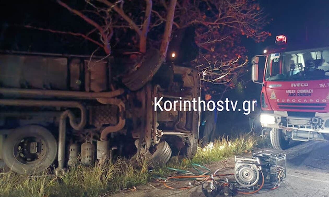 Κόρινθος: Μεγάλη επιχείρηση απεγκλωβισμού οδηγού νταλίκας που ανατράπηκε στα Δερβενάκια