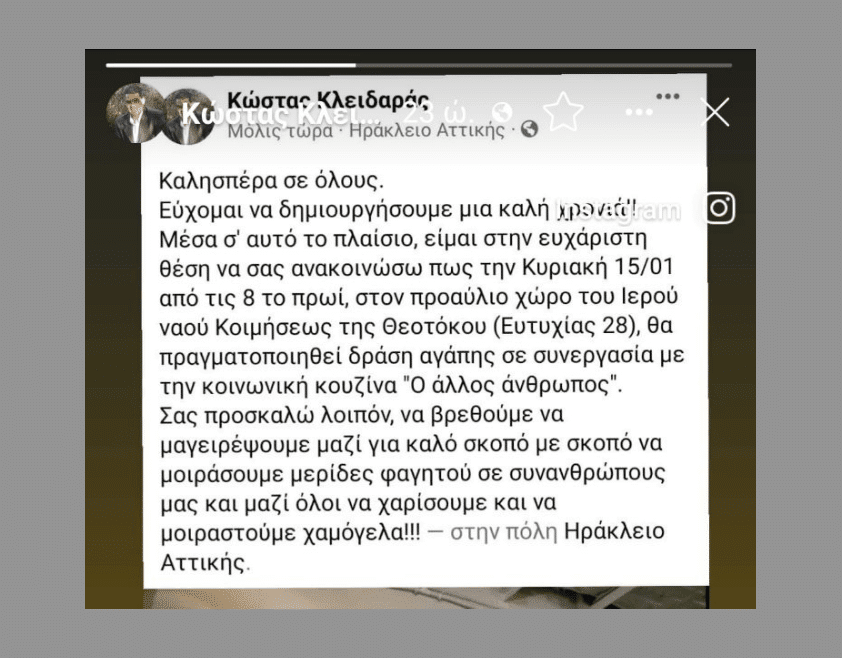 Ο πρώην υποψήφιος δημοτικός σύμβουλος για το Ηράκλειο Αττικής Κώστας Κλειδαράς, όπως πάντα, δείχνει το κοινωνικό του πρόσωπο αποτελώντας δίδαγμα για όλους εμάς που μέσα από την σκληρή πραγματικότητα ξεχνάμε τι σημαίνει πραγματικά άνθρωπος και πόσο ανεκτίμητης αξίας είναι ο κάθε ένας από εμάς είτε είναι πλούσιος, είτε φτωχός. Δεν πρέπει να ξεχνάμε ποτέ πως είναι πολύ εύκολο πλέον κάποιος να χάσει τα κεκτημένα του όπως δουλειά και σπίτι και να βρεθεί από νοικοκύρης στην ένδεια.