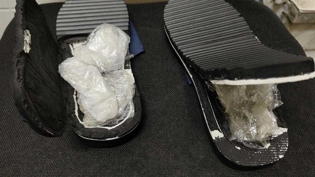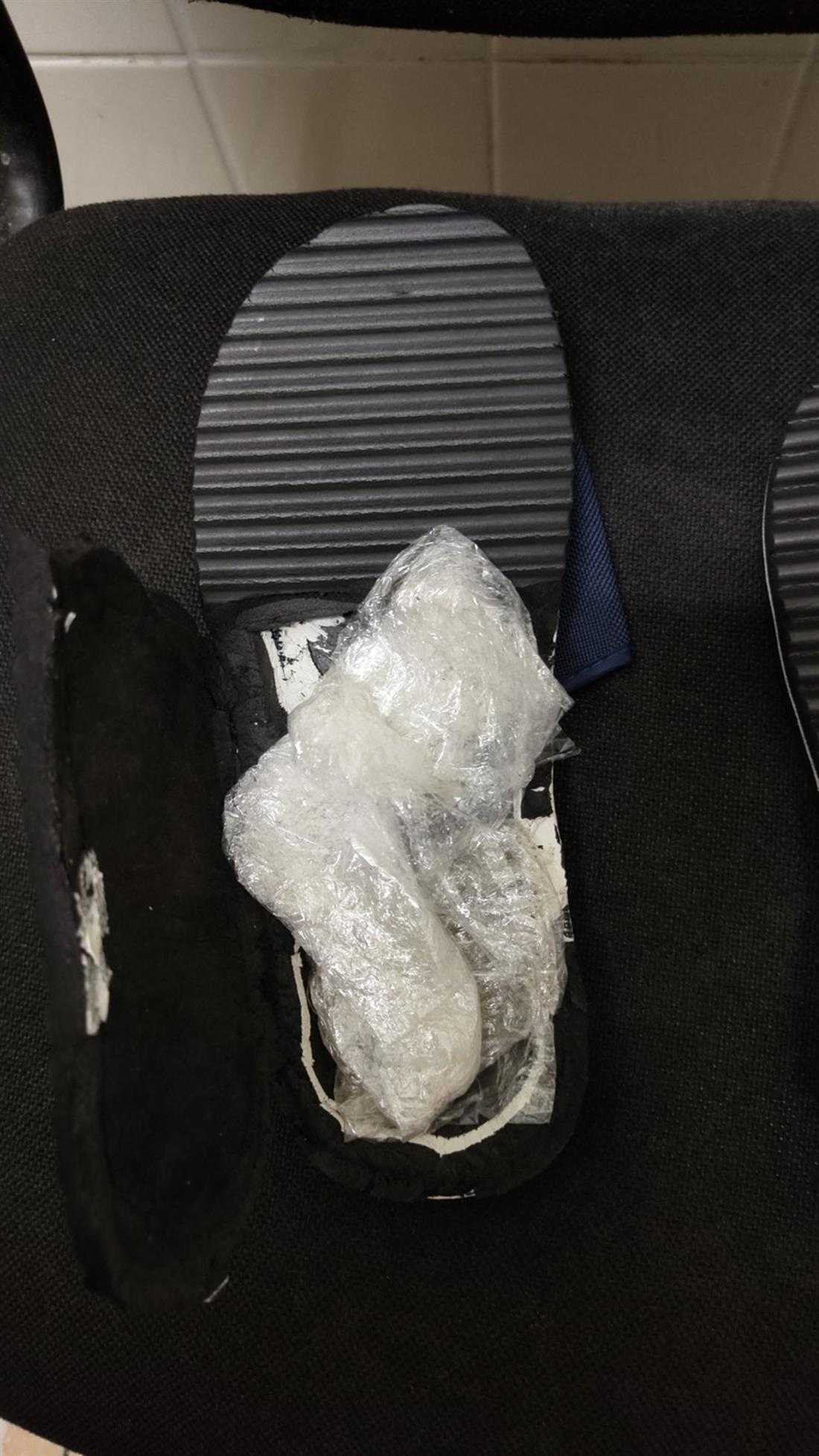 Η εξωτερική φρουρά είδε στην «ακτινογραφία» πως οι παντόφλες κάτι είχαν μέσα στον πάτο και ανοίγοντάς τες βρήκαν 56 γραμμάρια κρυσταλλικής σκόνης (μεθαμφεταμίνη) και 20 γραμμάρια πάστα χασίς.