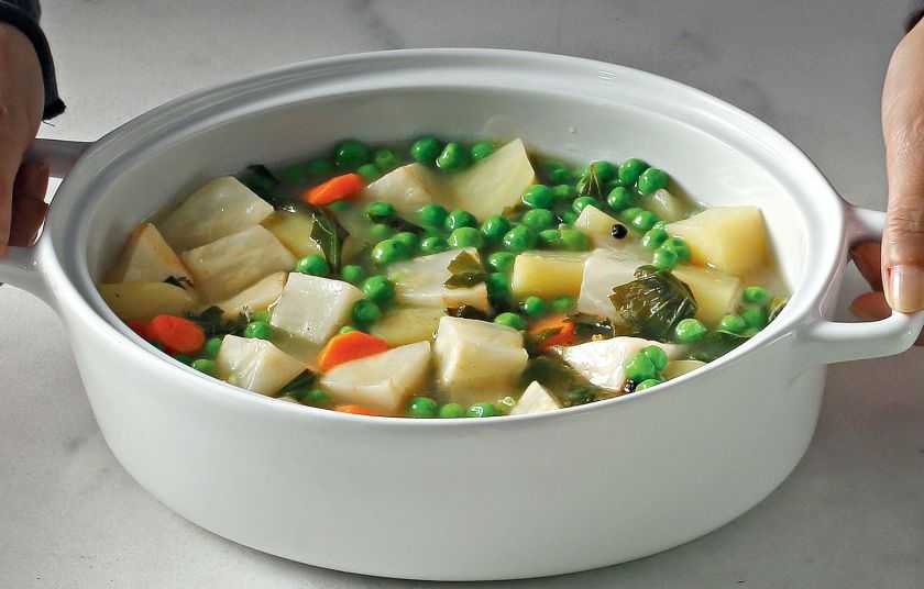 Σε μια φαρδιά κατσαρόλα σοτάρουμε στο λάδι σε μέτρια φωτιά τον αρακά για 3-4 λεπτά, μέχρι να ξεπαγώσει και να εξατμιστούν τα υγρά. Ρίχνουμε το κρεμμύδι, τη σελινόριζα, τα καρότα και τις πατάτες και συνεχίζουμε το σοτάρισμα για άλλα 4-5 λεπτά, να μαλακώσουν ελαφρώς. Αλατοπιπερώνουμε, ρίχνουμε το μπαχάρι και 150 ml νερό, χαμηλώνουμε τη φωτιά, σκεπάζουμε και σιγομαγειρεύουμε για 18-20 λεπτά, μέχρι να γίνουν τα λαχανικά. Ανακατεύουμε το αλεύρι με 200 ml χλιαρό νερό και τον χυμό λεμονιού και περιχύνουμε το φαγητό. Ανακατεύουμε απαλά και συνεχίζουμε το μαγείρεμα για άλλα 5 λεπτά, μέχρι να δέσει η σάλτσα.