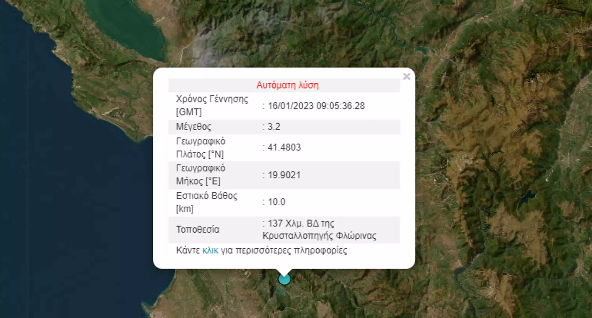 Ο σεισμός έχει μέγεθος 3,2 βαθμούς της κλίμακας Ρίχτερ, βάσει της αυτόματης λύσης του Γεωδυναμικού Ινστιτούτου. Επίκεντρο ο εστιακός χώρος που βρίσκεται στα 137 χιλιόμετρα βορειοδυτικά της Κρυσταλλοπηγής στη Φλώρινα.