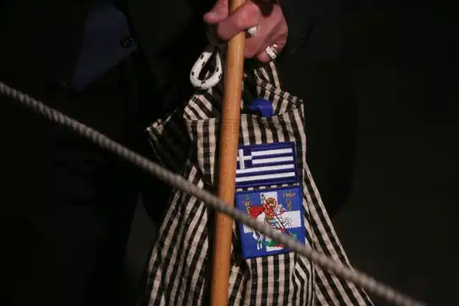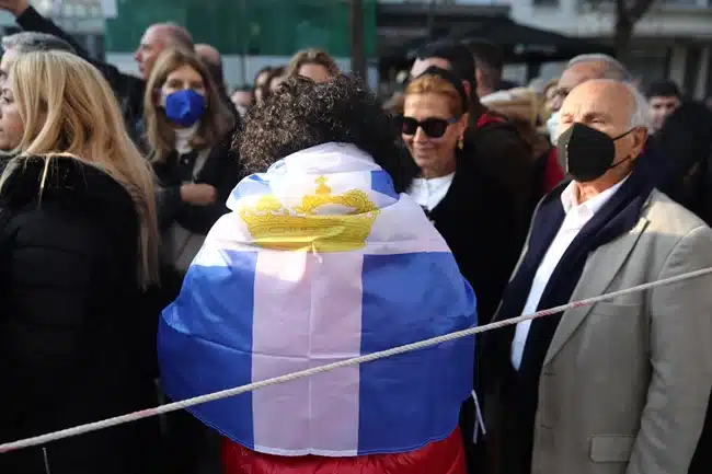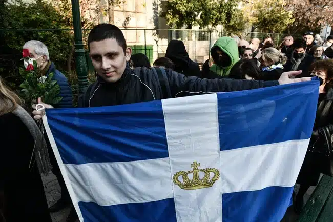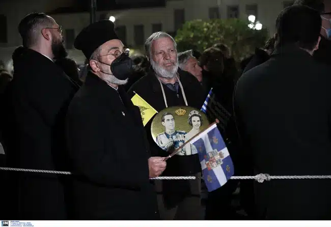 Αρκετοί από τους συγκεντρωμένους κρατούν ένα λουλούδι, ελληνικές σημαίες, σταυρούς ή και φωτογραφίες τους τέως βασιλιά Κωνσταντίνου με τη σύζυγό του, Άννα-Μαρία.