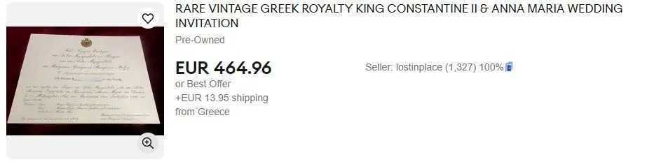 • Ευχετήρια κάρτα με την υπογραφή του Κωνσταντίνου Β’ πωλείται περίπου στα 180 ευρώ.