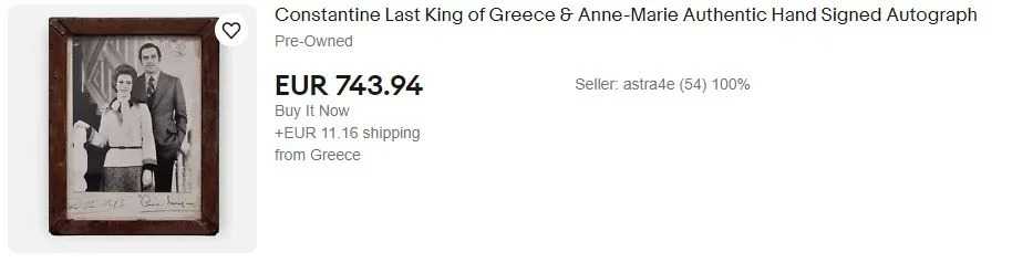 • Αυτόγραφο του άλλοτε βασιλικού ζεύγους πωλείται, κορνιζαρισμένο, προς 743,94 ευρώ.