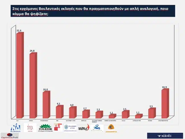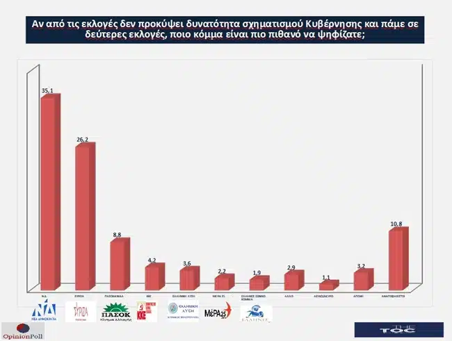 Η δημοσκόπηση δίνει στις δεύτερες κάλπες, ποσοστό της τάξης του 35-36% για τη Νέα Δημοκρατία, επίδοση που είναι κοντά στην αυτοδυναμία, χωρίς όμως να αποτελεί εγγύηση, αφού αυτό θα κριθεί από το ποσοστό των κομμάτων που θα μείνουν εκτός Βουλής. Αλλά αυτό θα το δούμε στη συνέχεια. Ας ξεκινήσουμε με τις επιλογές των πολιτών στις πρώτες εκλογές που θα γίνουν με το σύστημα της απλής αναλογικής, πιθανώς τον Απρίλιο ή και τον Μάιο, όπως δήλωσε πρόσφατα ο πρωθυπουργός.
