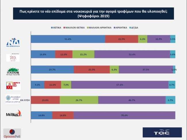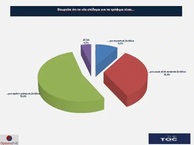 Την ίδια στιγμή, το επίδομα για την αγορά τροφίμων αξιολογείται ως θετικό από περισσότερους πολίτες, με το 46.7% των ερωτηθέντων να εκφράζεται θετικά, ενώ το 49.1% έχει αντίθετη άποψη.