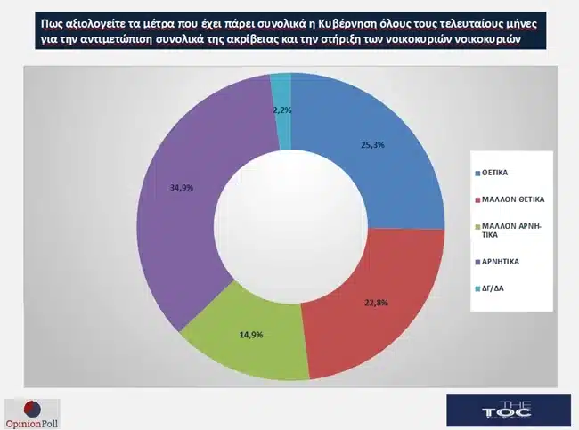 Ιδιαίτερη αξία πάντως για την συνολική αποτύπωση της ικανοποίησης των πολιτών από το πώς έχει χειριστεί συνολικά η Κυβέρνηση το θέμα της ακρίβειας και πώς έχει στηρίξει τα νοικοκυριά με όσα μέτρα έχει πάρει στο διάστημα των τελευταίων μηνών, έχει και η απάντηση στην συνολική ερώτηση. Σ΄αυτή το 48.1% απαντά θετικά για την συνολική στάση και τα μέτρα της Κυβέρνησης , με το 49.8%να έχει αρνητική άποψη. Μοιάζει σαν μια κοινωνία χωρισμένη στα δύο.