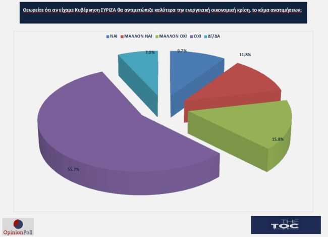 Από πολιτικής άποψης, έχει σημασία ότι ενώ το 48.1% δηλώνει πολύ και αρκετά ικανοποιημένο από την στάση και τα μέτρα της Κυβέρνησης για την αντιμετώπιση της ακρίβειας, το 21.5% δηλώνει ότι θα ήταν καλύτερα τα πράγματα αν είχαμε Κυβέρνηση ΣΥΡΙΖΑ , με το 71.5% να έχει αντίθετη άποψη. Μόνο ανάμεσα στους ψηφοφόρους του ΣΥΡΙΖΑ υπάρχει πλειοψηφική απάντηση ότι τα πράγματα θα ήταν καλύτερα με κυβέρνηση Τσίπρα ( 51.8%). Ανάμεσα στους ψηφοφόρους των άλλων κομμάτων, τα ποσοστά που θεωρούν ότι τα πράγματα θα ήταν καλύτερα με κυβέρνηση Τσίπρα, είναι: