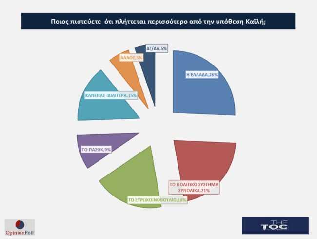 Το θέμα της εμπλοκής της Εύας Καϊλή στο Qatargate δεν φαίνεται να απασχολεί ιδιαίτερα απ΄ότι φαίνεται από τον πίνακα συγκριτικής αξιολόγησης των προβλημάτων που απασχολούν τους πολίτες. Στην ερώτηση ποιος πλήττεται περισσότερο από το σκάνδαλο η σειρά είναι : Η Ελλάδα 26,0 %, το Πολιτικό Σύστημα 21.0 %, το Ευρωκοινοβούλιο 18.0 %, το ΠΑΣΟΚ 9%, ενώ το 15,0 % θεωρεί ότι δεν πλήττεται κανένας ιδιαίτερα.