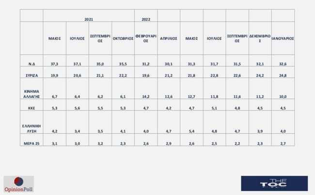 Σημειώνουμε ότι σε σχέση με την πρώτη μέτρηση του 2022, υπάρχει αύξηση της Ν.Δ κατά 1.4% και του ΣΥΡΙΖΑ κατά 5.2%, κάτι που κατά την διάρκεια του τελευταίου χρόνου έφερε μείωση της διαφοράς από 11.6% στο 7.8%. Δείτε παρακάτω τις μετρήσεις του 2022 και του 2021 και την εξέλιξη της πρόθεσης ψήφου για τα κόμματα από το γκάλοπ της Opinion Poll τον Μάιο του 21, έως και τον Ιανουάριο του 23.