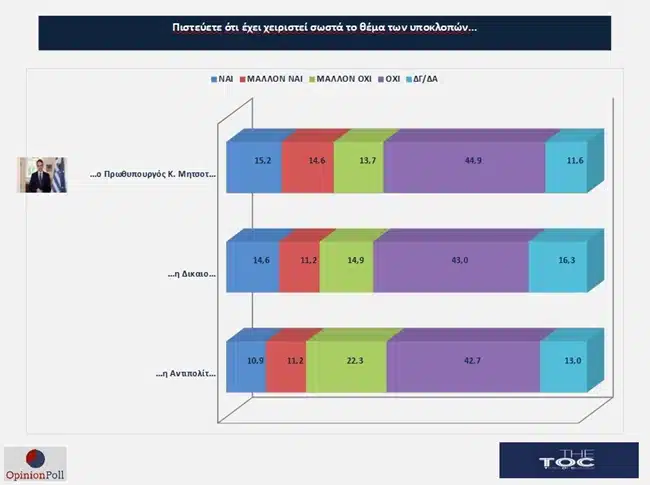 Σχετικά με το πως έχουν χειριστεί την υπόθεση των υποκλοπών η Κυβέρνηση, η Αντιπολίτευση και η Δικαιοσύνη, είναι σημαντικό το εύρημα-μήνυμα και προς τις τρεις πλευρές, ότι το ισοζύγιο θετικών- αρνητικών αξιολογήσεων είναι καθαρά αρνητικό και για τους τρεις. Για τον Πρωθυπουργό και την Κυβέρνηση θετική άποψη έχει το 29.8% έναντι 58.6% που έχει αρνητική, για την Δικαιοσύνη είναι 25.8% έναντι 57.9% και για την Αντιπολίτευση 22.1% έναντι 65%.