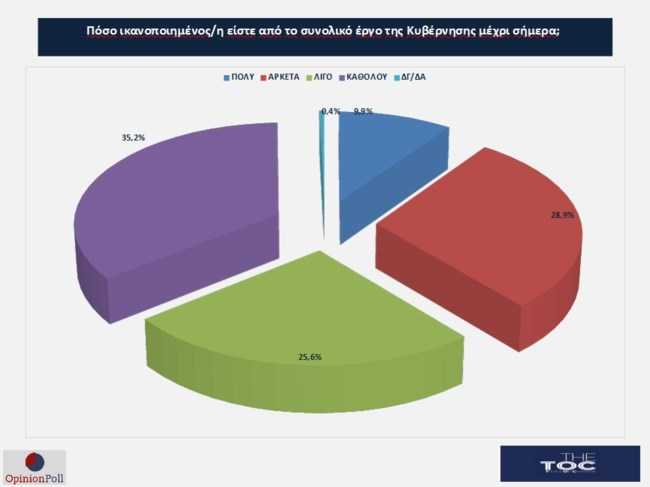 Ικανοποιημένο από το κυβερνητικό έργο δηλώνει το 38.8%, με το 60.8% να έχει αντίθετη άποψη. Τα μεγαλύτερα ποσοστά ικανοποίησης βρίσκονται ανάμεσα στους ψηφοφόρους της Ν.Δ με 69.1%, της ΕΛΛΗΝΙΚΗΣ ΛΥΣΗΣ με 66.7% και του ΠΑΣΟΚ – ΚΙΝΑΛ με 45.3%. Ανάμεσα στους ψηφοφόρους του ΣΥΡΙΖΑ η ικανοποίηση είναι στο επίπεδο του 15.5%.