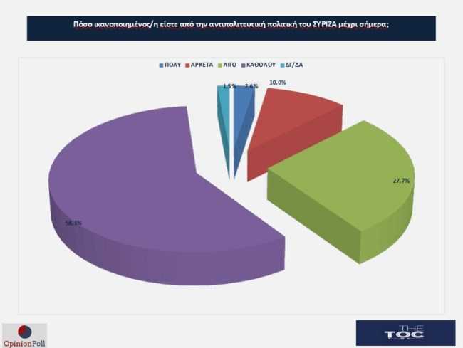 Την ίδια στιγμή η ικανοποίηση από την αντιπολιτευτική πολιτική του ΣΥΡΙΖΑ είναι μόλις 12.6% με το 86% να έχει αντίθετη άποψη. Το μεγαλύτερο ποσοστό βρίσκεται- όπως αναμένεται- ανάμεσα στους ψηφοφόρους του ΣΥΡΙΖΑ, με 28.5% των αριστερών ψηφοφόρων να δηλώνουν πολύ και αρκετά ικανοποιημένοι από την αντιπολίτευση Τσίπρα, ενώ λίγο ικανοποιημένο δηλώνει το 38,5% και καθόλου το 31,7%. Σε όλα τα άλλα κομματικά ακροατήρια η ικανοποίηση κυμαίνεται από 3% έως 12.3%.