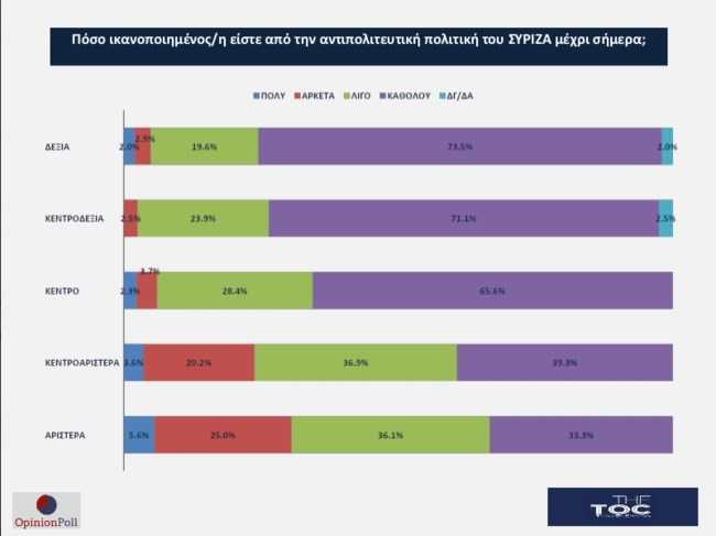 Στον χώρο του Κέντρου η ικανοποίηση για την αντιπολίτευση του ΣΥΡΙΖΑ είναι της τάξης του 6,0 %, γεγονός που δείχνει τη δυσκολία που έχει το κόμμα του Αλέξη Τσίπρα να προσεγγίσει το κεντρώο κοινό.