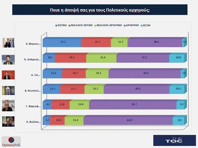 Ο Πρωθυπουργός είναι ο δημοφιλέστερος Πολιτικός Αρχηγός με 48,2 % θετικές και μάλλον θετικές απόψεις. Ακολουθούν οι Ν. Ανδρουλάκης, Α. Τσίπρας και Δ. Κουτσούμπας με 30.7%, 30.3% και 29.3% αντίστοιχα, ενώ ακολουθούν ο Γ. Βαρουφάκης με 19% και ο Κ. Βελόπουλος με 15.6%.