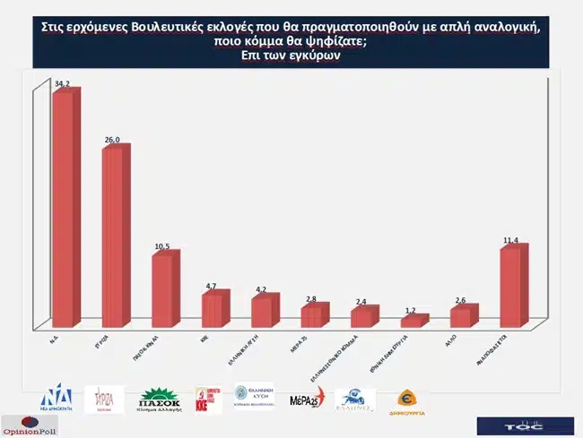 Επίσης, επισημαίνουμε, ότι όταν βλέπουμε την πρόθεση ψήφου επί των εγκύρων, η Ν.Δ συγκεντρώνει 34.2% και ο ΣΥΡΙΖΑ 26%, η διαφορά δηλαδή γίνεται 8.2%.