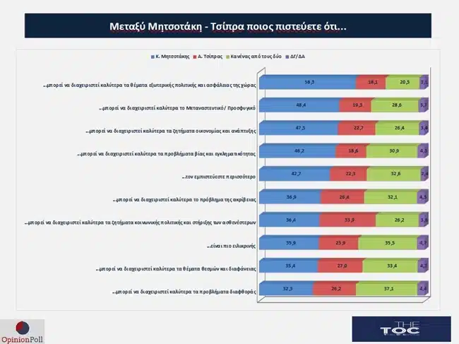 Ο Πρωθυπουργός Κ. Μητσοτάκης προηγείται στην δυνατότητα διαχείρισης κρίσιμων κυβερνητικών τομέων έναντι του Α. Τσίπρα. Πιο μεγάλη είναι η υπεροχή στα θέματα εξωτερικής πολιτικής με 58.3% έναντι 18.1%, στο Μεταναστευτικό με 48.4% έναντι 19.3%, στα θέματα Οικονομίας και Ανάπτυξης με 47.5% έναντι 22.7%, στην αντιμετώπιση των φαινομένων βίας και εγκληματικότητας με 46.2% έναντι 18.6%.