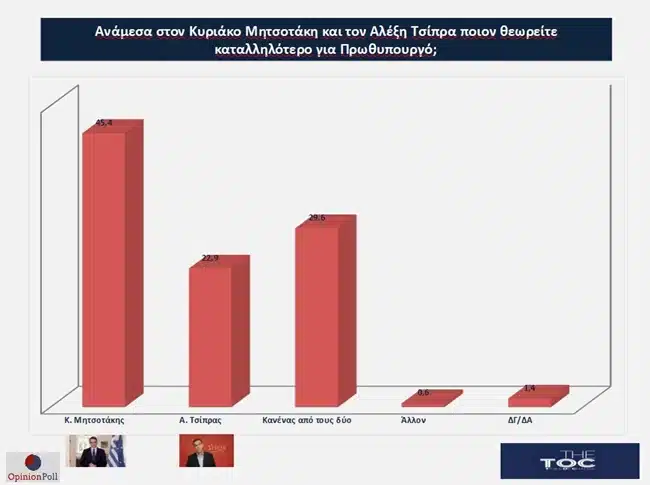 Ως καταλληλότερο για Πρωθυπουργό επιλέγει το 45.4% τον Κ. Μητσοτάκη έναντι του 22.9% που επιλέγει τον Αλέξη Τσίπρα και του 29.6% που επιλέγει τον Κανένα. Τις καλύτερες επιδόσεις ο Κ. Μητσοτάκης παρουσιάζει ανάμεσα στους ψηφοφόρους της Ν.Δ με 80.6% έναντι 6% του Α. Τσίπρα και τους ψηφοφόρους του ΠΑΣΟΚ – ΚΙΝΑΛ που επιλέγεται από το 62.5% έναντι του 15.6% που επιλέγει τον Α. Τσίπρα, εύρημα που έχει ενδιαφέρον για τον τρόπο που αντιμετωπίζουν οι ψηφοφόροι της κεντροαριστεράς τον πρωθυπουργό.