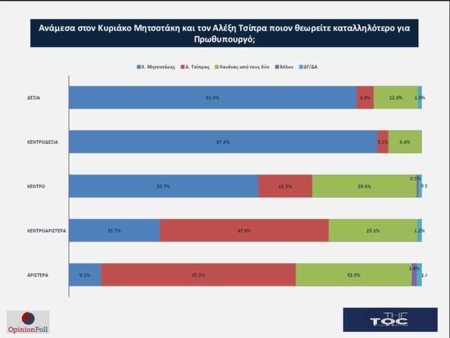 Στον χώρο του Κέντρου, ο Κυριάκος Μητσοτάκης επιλέγεται από το 53.7% έναντι του 15.3% που επιλέγει τον Α. Τσίπρα.