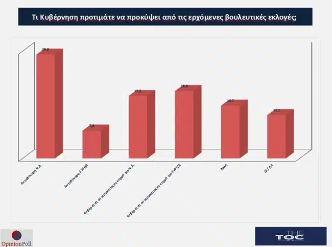Το 29% προτιμά αυτοδύναμη Κυβέρνηση Ν.Δ , το 18.8% Κυβέρνηση συνεργασίας με κορμό τον ΣΥΡΙΖΑ, το 17.5% Κυβέρνηση συνεργασίας με κορμό την Ν.Δ, το 7.8% αυτοδύναμη Κυβέρνηση ΣΥΡΙΖΑ και το 14.7% κάποιο άλλο σχήμα( οικουμενική, Κυβέρνηση τεχνοκρατών κ.ά) . Στον χώρο του Κέντρου το 31.9% προτιμά αυτοδύναμη Κυβέρνηση Ν.Δ, το 25.9% Κυβέρνηση συνεργασίας με κορμό την Ν.Δ , το 15.3% Κυβέρνηση συνεργασίας με κορμό το ΣΥΡΙΖΑ , το 5.6% αυτοδύναμη Κυβέρνηση ΣΥΡΙΖΑ.