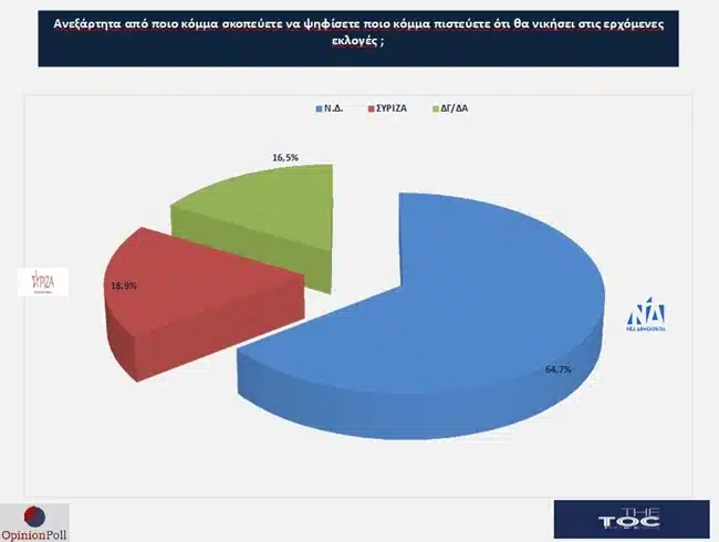 Η παράσταση νίκης δίνει συντριπτικό αποτέλεσμα υπέρ της Ν.Δ στις ερχόμενες εκλογές . Αυτό πιστεύει το 64.7% έναντι 18.9% που θεωρεί ότι θα νικήσει στις εκλογές ο ΣΥΡΙΖΑ.