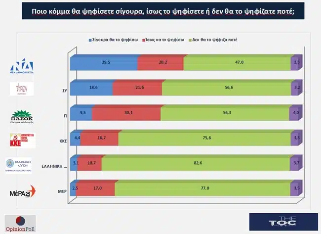 Η τελευταία κάρτα αφορά το ποιο κόμμα οι ψηφοφόροι θα ψήφιζαν σίγουρα- προηγείται η Νέα Δημοκρατία- ποιο κόμμα πιθανώς να ψήφιζαν, όπου τα ποσοστά της Νέας Δημοκρατίας και του ΣΥΡΙΖΑ είναι περίπου τα ίδια, με το ΠΑΣΟΚ όμως να εμφανίζεται ως μια πιθανή προοπτική για μια σημαντική μερίδα ψηφοφόρων, και τα μικρά κόμματα, ΚΚΕ, ΜεΡΑ25 και Ελληνική Λύση να είναι τα κόμματα που οι ψηφοφόροι δεν θα ψήφιζαν επ΄ουδενί.