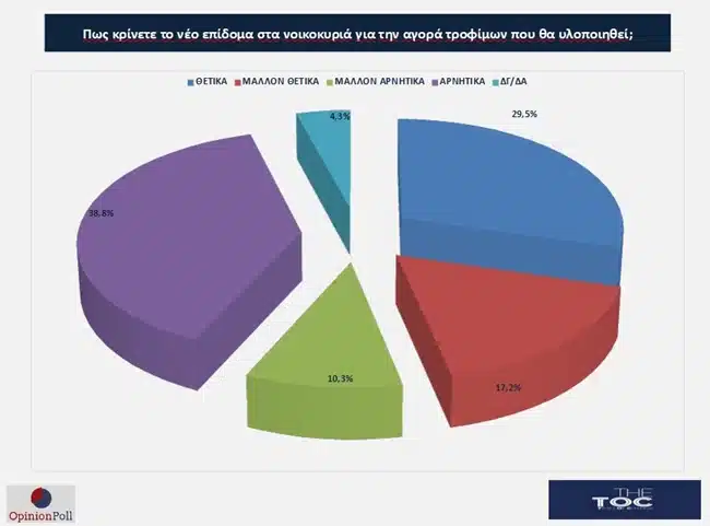 Όσον αφορά στα μέτρα της κυβέρνησης το 38.2% θεωρεί θετική και μάλλον θετική την πρωτοβουλία για το καλάθι του νοικοκυριού, με την πλειοψηφία όμως, το 56.5% να έχει αντίθετη άποψη.