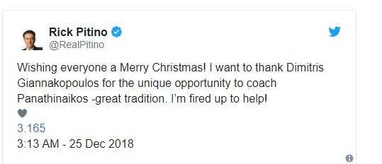 Νέος προπονητής του Παναθηναϊκού έως το τέλος της τρέχουσας σεζόν θα είναι εκτός συγκλονιστικού απροόπτου ο Ρικ Πιτίνο που φρόντισε μέσω του προφίλ του στο Twitter ανήμερα των Χριστουγέννων να στείλει το μήνυμα στους φίλους της ομάδας.