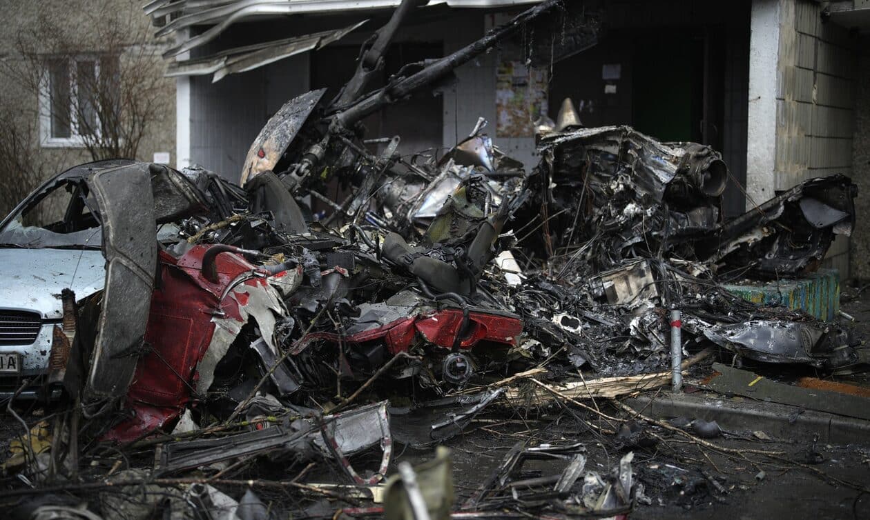 Πτώματα κείτονταν στο έδαφος αυλής, μετά το δυστύχημα με το ελικόπτερο –ένα γαλλικό Super Puma, σύμφωνα με την περιγραφή εκπροσώπου της ουκρανικής πολεμικής αεροπορίας– το οποίο προσέκρουσε σε κτίριο στην Μπρόβαρι, στην περιφέρεια του Κιέβου.