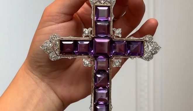 Ο σταυρός από αμέθυστο δημιουργήθηκε από τον σχεδιαστή πολυτελών κοσμημάτων Γκάραρντ (Garrard) το 1920. Η πριγκίπισσα Νταϊάνα το είχε φορέσει σε πολλές ιδιωτικές της στιγμές αλλά και σε φιλανθρωπικό γκαλά στο Λονδίνο τον Οκτώβριο του 1987. Σε εκείνη την εμφάνιση το είχε συνδυάσει με ένα εξαιρετικό μπαρόκ βελούδινο φόρεμα του οίκου Catherine Walker & Co.