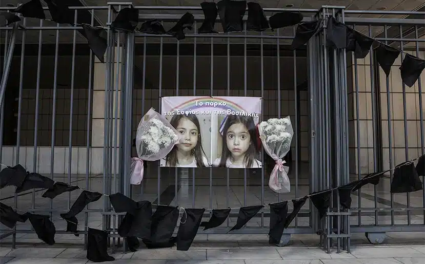 Ράγισαν καρδιές οι τεράστιες φωτογραφίες των δυο χαμογελαστών μικρών κοριτσιών και οι μαύρες σημαίες στα κάγκελα έξω από τη δικαστική αίθουσα όπου εκδικάζεται η υπόθεση της φονικής πυρκαγιάς στο Μάτι. Η εικόνα της Σοφίας και της Βασιλικής Φιλιπποπούλου στο πάρκο τους μέσα σε ένα ουράνιο τόξο και δίπλα τους δυο ροζ ανθοδέσμες συγκλόνισε. Οι δίδυμες αδελφούλες βρέθηκαν στο οικόπεδο της οικογένειας Φράγκου σφιχταγκαλιασμένες μαζί με τον παππού τους Φίλιππο και τη γιαγιά τους, Σοφία που προσπάθησαν να βρουν ένα ασφαλές μέρος για να τις προστατεύσουν από τις φλόγες αλλά δεν τα κατάφεραν.