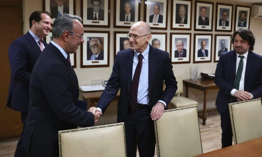 Ο υπουργός Οικονομικών Χρήστος Σταϊκούρας συναντήθηκε σήμερα στο υπουργείο Οικονομικών με τον Πρόεδρο του Εποπτικού Συμβουλίου του Ενιαίου Εποπτικού Μηχανισμού (Single Supervisory Mechanism – SSM) της Ευρωπαϊκής Κεντρικής Τράπεζας Ανδρέα Ένρια.