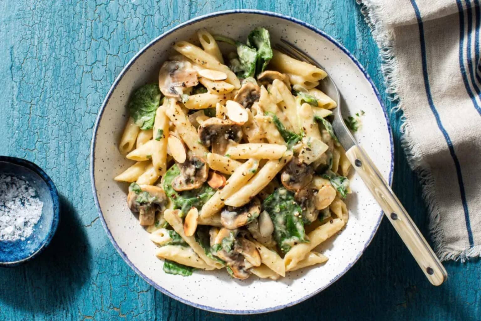 Φτιάξτε ένα γρήγορο, θρεπτικό δείπνο ζυμαρικών με μανιτάρια, σκόρδο και σπανάκι. Τα κάσιους και τα αποξηραμένα μανιτάρια δημιουργούν μια απολαυστική κρεμώδη αλλά ελαφριά σάλτσα.