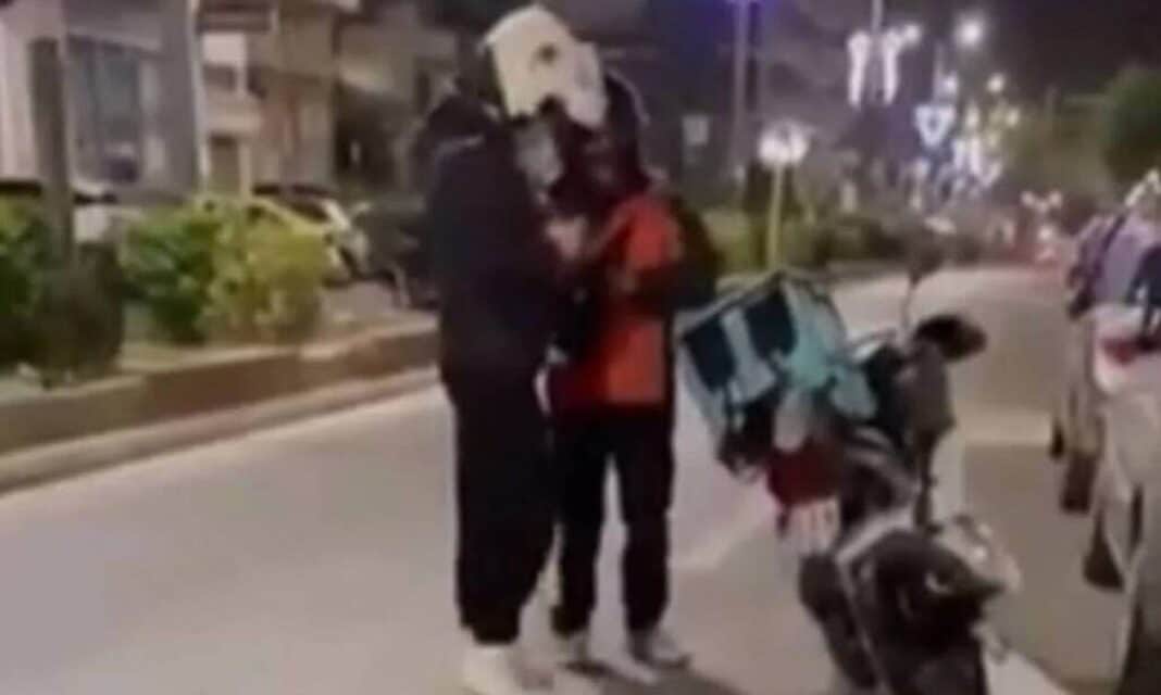 Στο βίντεο, διακρίνεται ένας νεαρός με λευκό κράνος και ενδυμασία που θυμίζει αστυνομικό, να έχει σταματήσει έναν διανομέα και να του ζητάει τα χαρτιά του.