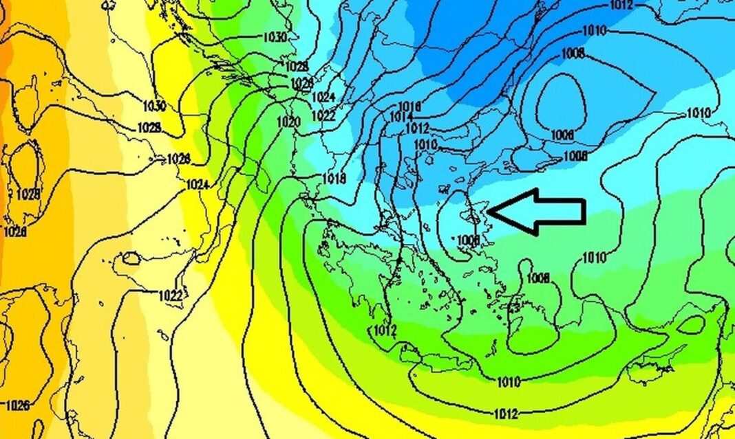 Αυτό το αναμένουμε κοντά στο μεσημέρι του Σαββάτου με μια αρκετά οργανωμένη και σαφώς πιο έντονη επιδείνωση του καιρού. Αιτία αυτής της επιδείνωσης όπως μπορούμε να δούμε στον δεύτερο χάρτη μας με το μαύρο βέλος ο σχηματισμός ενός νέου βαρομετρικού χαμηλού όπου σε αντίθεση με το πρώτο σταδιο υποστηρίζεται από πολύ πιο ψυχρή αέρια μάζα (μπλε αποχρώσεις) και σε συνδυασμό με τα νερά του Αιγαίου θα δόσει “πλούσια” και συνάμα επικίνδυνα φαινόμενα σε αρκετές περιοχές.