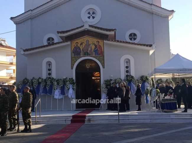 Νωρίτερα έφθασε το σκεπασμένο με την ελληνική σημαία φέρετρο στον Ιερό Ναό Προφήτη Ηλία Τριπόλεως. Το παρών δίνουν η Πρόεδρος της Δημοκρατίας, Κατερίνα Σακελλαροπούλου, ο Πρωθυπουργός, Κυριάκος Μητσοτάκης, τον οποίο συνοδεύει ο υπουργός Εθνικής Άμυνας Νίκος Παναγιωτόπουλος και ο πρόεδρος του ΣΥΡΙΖΑ-Προοδευτική Συμμαχία, Αλέξης Τσίπρας.