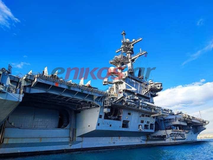 Στις αποκλειστικές φωτογραφίες του enikos.gr, που έφθασε μία ανάσα από το αεροπλανοφόρο, μπορεί εύκολα κάποιος να διαπιστώσει το επιβλητικό του μέγεθος. Μία πλωτή πολιτεία με πάνω από 5.000 άτομα προσωπικό και ιπταμένους, για την υποστήριξη των 85 μαχητικώνF/A-18C Ηοrnet, F/A-18E/F Super Hornet, ηλεκτρονικού Πολέμου EA-18G Growler, ιπτάμενα ραντάρ Ε-2C Hawkeye και ελικόπτεραΗΗ-60H, που βρίσκονται στην πίστα απονήωσης και τους 9 ορόφους αμπάρια.