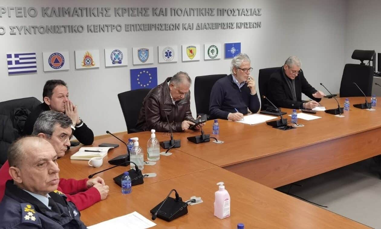 Στη σύσκεψη μετείχαν ο Υπουργός Προστασίας του Πολίτη, Παναγιώτης Θεοδωρικάκος, ο Αναπληρωτής Υπουργός Εσωτερικών Στέλιος Πέτσας, ο Υφυπουργός Κλιματικής Κρίσης και Πολιτικής Προστασίας Ευάγγελος Τουρνάς, ο Υφυπουργός Προστασίας του Πολίτη Ελευθέριος Οικονόμου, ο Γενικός Γραμματέας Πολιτικής Προστασίας Βασίλειος Παπαγεωργίου, ο Αρχηγός του Πυροσβεστικού Σώματος Αντιστράτηγος Γεώργιος Πουρναράς και ο Υπαρχηγός, Αντιστράτηγος Μάριος Αποστολίδης, ο Επιτελάρχης, Αντιστράτηγος Χρήστος Λάμπρης, ο Αρχηγός της Ελληνικής Αστυνομίας, Αντιστράτηγος Κωνσταντίνος Σκούμας, ο Προϊστάμενος Κλάδου Τάξης/ΑΕΑ, Υποστράτηγος Γεώργιος Μιχαλόπουλος, ο Προϊστάμενος Επιτελείου/ΑΕΑ, Αντιστράτηγος Ελευθέριος Γκαρίλας, ο Διευθυντής Τροχαίας Αττικής Ταξίαρχος Χρήστος Παπαφιλίππου, ο Διοικητής ΕΣΚΕΔΙΚ, Υποστράτηγος Θεόδωρος Βάγιας, ο Διευθυντής Σχεδιασμού Αντιμετώπισης Εκτάκτων Αναγκών της Γενικής Γραμματείας Πολιτικής Προστασίας Δημήτρης Αλεξανδρής, ο πρόεδρος του ΕΚΑΒ Νίκος Παπαευσταθίου, η Εθνική Μετεωρολογική Υπηρεσία (ΕΜΥ) και η επιστημονική ομάδα μετεωρολόγων.