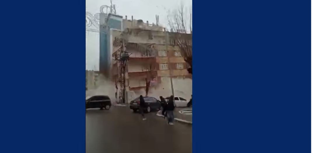 Στο βίντεο του «The Guardian» φαίνεται ένα πολυώροφο κτίριο να καταρρέει σαν χάρτινος πύργος τη στιγμή που ο Εγκέλαδος ταρακουνάει την γείτονα χώρα. Το βίντεο έχει τραβηχτεί στην πόλη Σανλιούρφα, η οποία μετρά πολλά θύματα.