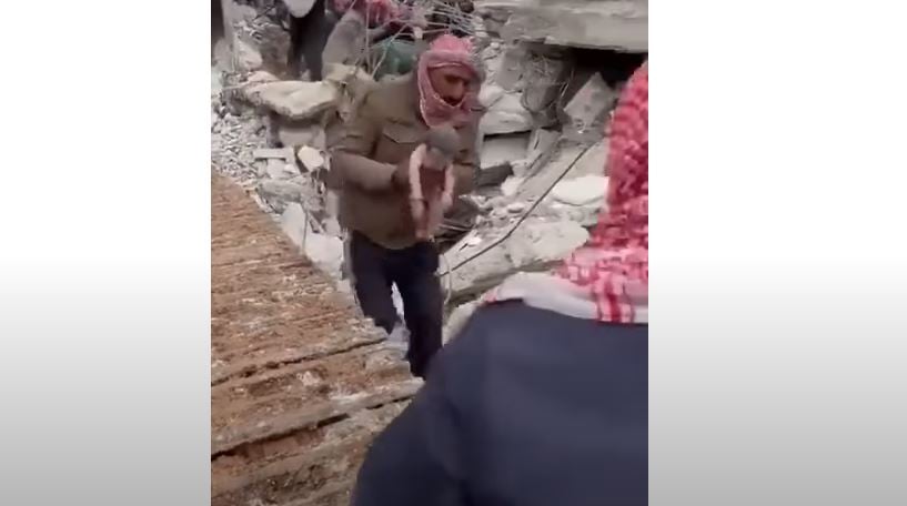 Σε βίντεο που κυκλοφόρησε στα μέσα κοινωνικής δικτύωσης, φαίνεται ένας άνδρας να κρατά μέσα στα ερείπια ένα γυμνό βρέφος, καλυμμένο με σκόνη, με τον ομφάλιο λώρο να κρέμεται.