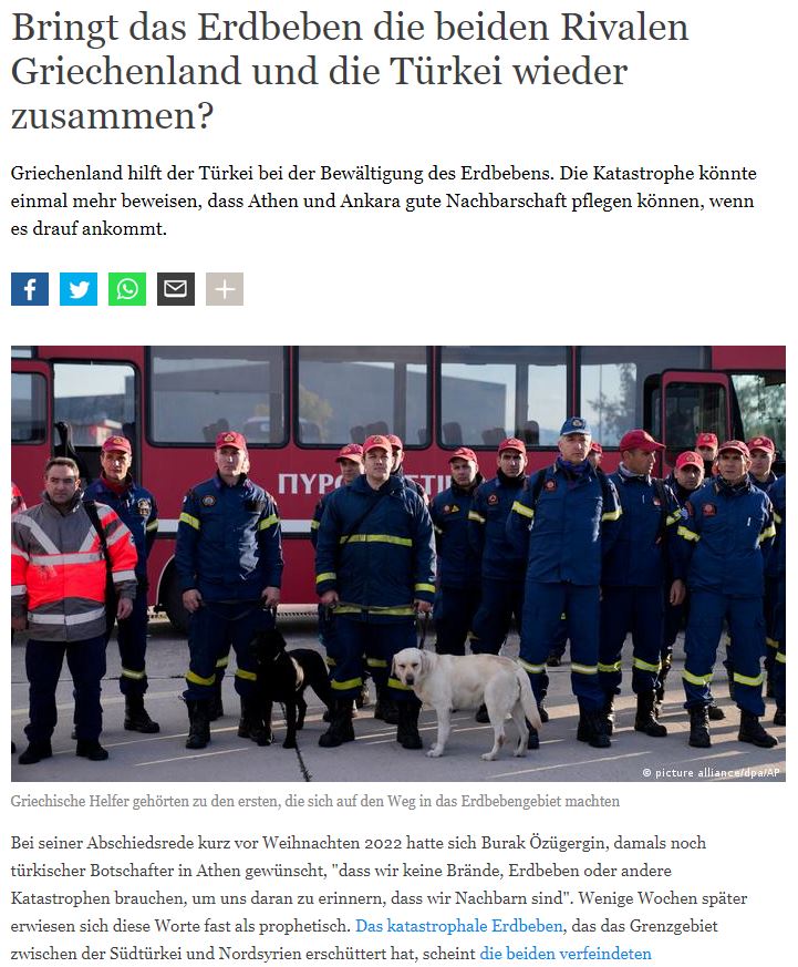 Στη γερμανόφωνη υπηρεσία της Deutsche Welle δημοσιεύεται άρθρο με τίτλο «Καταστροφή στην Τουρκία: Θα φέρει ξανά κοντά ο σεισμός τους δύο αντιπάλους Ελλάδα και Τουρκία;» και υπότιτλο «Η Ελλάδα βοηθά την Τουρκία να αντιμετωπίσει τον σεισμό. Η καταστροφή θα μπορούσε να αποδείξει για ακόμα μια φορά ότι η Αθήνα και η ‘Αγκυρα μπορούν να είναι καλοί γείτονες, όταν αυτό χρειάζεται». Στο ρεπορτάζ επισημαίνεται πάντως ότι είναι δύσκολο να προβλέψει κανείς «κατά πόσον οι εχθρικά διακείμενοι γείτονες θα συμφιλιωθούν και αυτή τη φορά, όπως είχε συμβεί το 1999», λόγω των εκλογικών αναμετρήσεων που επίκεινται και στις δύο χώρες.