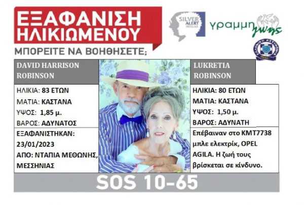 Η ΓΡΑΜΜΗ ΖΩΗΣ ειδοποιήθηκε από την οικογένειά τους το απόγευμα της 08/02/2023 και ενεργοποίησε Silver Alert. Η ζωή τους βρίσκεται σε κίνδυνο.