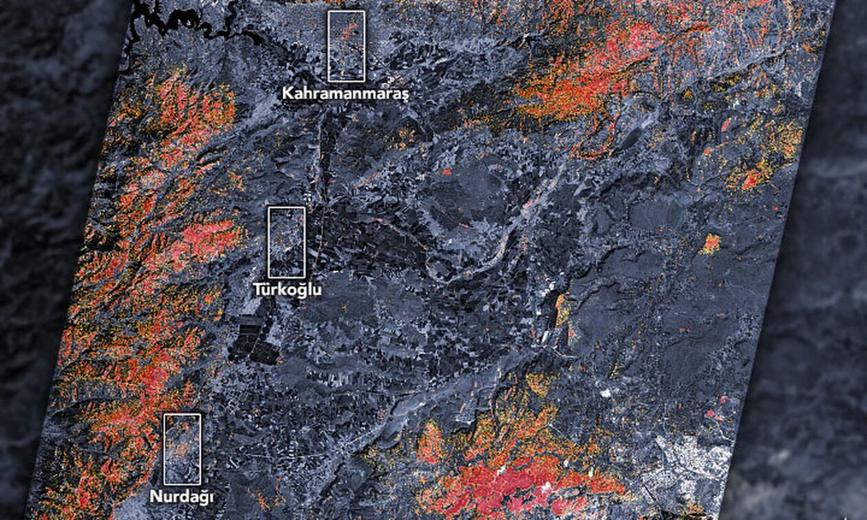 Ο χάρτης – τα δεδομένα του οποίου συλλέχθηκαν από το PALSAR-2 του προηγμένου δορυφόρου παρατήρησης ALOS-2 (Advanced Land Observing Satellite-2) στις 8 Φεβρουαρίου 2023 – δείχνει τμήματα των πόλεων Turkoglu, Kahramanmaras και Nurdagi.