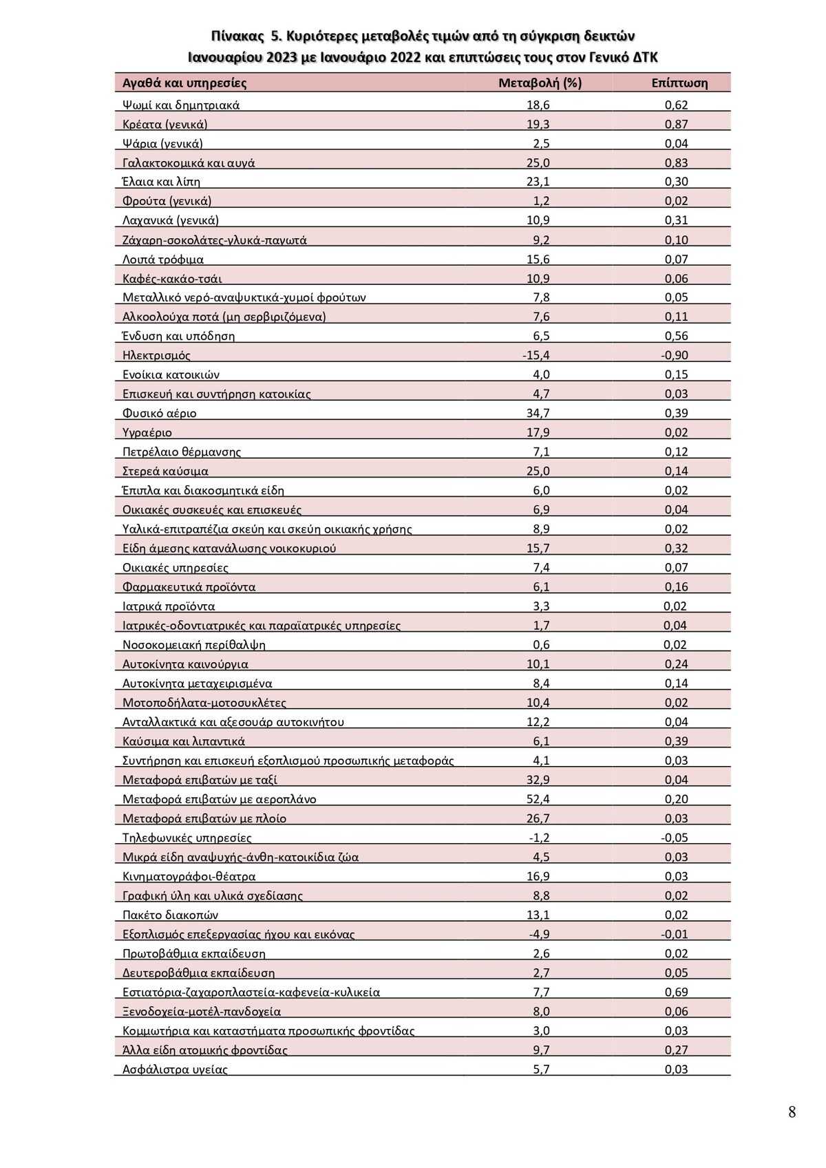 Αναλυτικά η αύξηση του πληθωρισμού κατά 7% τον μήνα Ιανουάριο 2023, σε σύγκριση με τον αντίστοιχο δείκτη του Ιανουαρίου 2022, προήλθε κυρίως από τις μεταβολές στις ακόλουθες ομάδες αγαθών και υπηρεσιών: