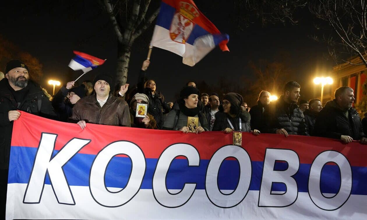 Χιλιάδες μέλη οργανώσεων διαδήλωσαν μπροστά από το προεδρικό μέγαρο στο Βελιγράδι φωνάζοντας συνθήματα κατά του προέδρου της Δημοκρατίας Αλεξάνταρ Βούτσιτς, τον οποίο κατηγορούν ότι «ξεπούλησε το Κόσοβο».