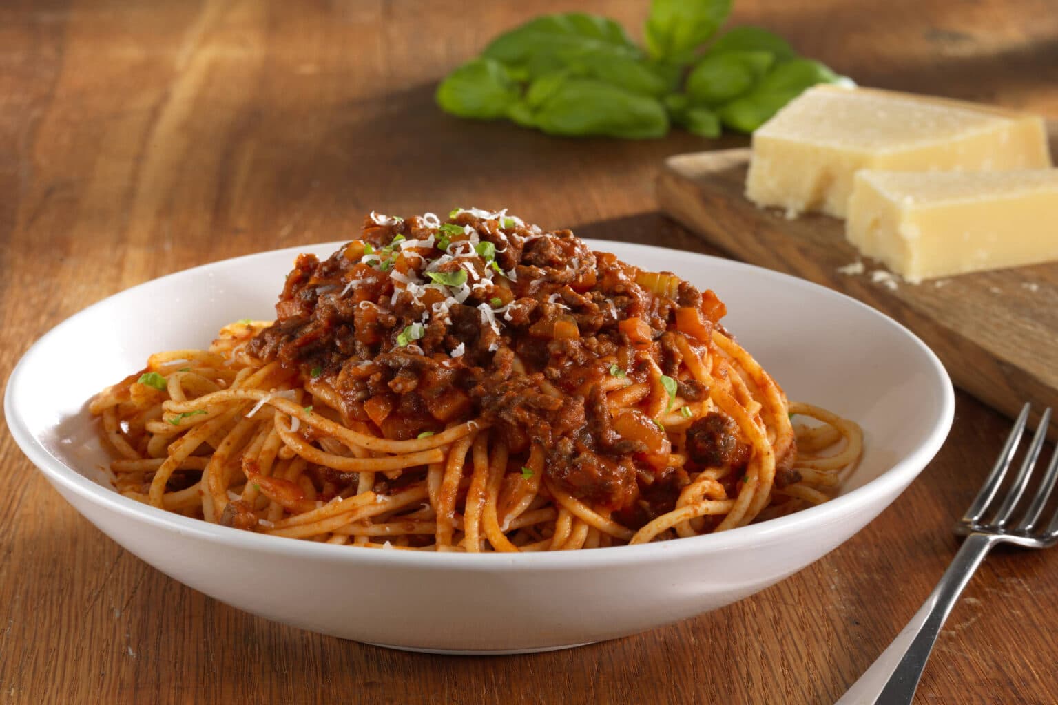 Μαγειρεύουμε τα μακαρόνια ακολουθώντας τις οδηγίες της συσκευασίας και στη συνέχεια ανακατεύουμε τη μισή παρμεζάνα στο Bolognese. Βάζουμε μια κουταλιά από το νερό των ζυμαρικών στη σάλτσα για να χαλαρώσει αν φαίνεται πολύ πηχτή και μετά στραγγίζουμε τα μακαρόνια. Για καλύτερη γεύση, ρίχνουμε τα ζυμαρικά στη σάλτσα, ανακατεύουμε τα όλα μαζί να επικαλυφθούν και αλατοπιπερώνουμε καλά. Προσθέτουμε την υπόλοιπη παρμεζάνα και μερικά φύλλα βασιλικού.