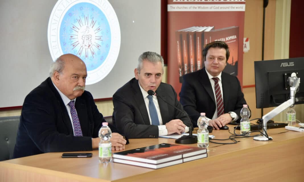 Οι ναοί της του Θεού Σοφίας ανά τον κόσμο» που πραγματοποιήθηκε στο πανεπιστήμιο La Sapienza της Ρώμης. Εξαιρετικές εισηγήσεις ανέπτυξαν οι καθηγητές κ. Antonio Lacobini με θέμα «Η Αγία Σοφία του Ιουστινιανού. Ένα θαυμαστό αιώνιο μνημείο», και κ. Alessandro Taddei με θέμα «Η Αγία Σοφία πριν από τον Ιουστινιανό. Η προϊστορία της Μεγάλης Εκκλησίας της Κωνσταντινούπολης». Χαιρετισμό απηύθηναν η κοσμήτορας της Φιλοσοφικής Σχολής και Λογοτεχνίας, κ. Arianna Punzi, ο Διευθυντής του Τμήματος Ιστορίας Ανθρωπολογίας, Θρησκειών, Τέχνων και Θεάματος, καθηγητής κ. Gaetano Lettieri, ενώ την παρουσίαση συντόνισε ο αναπληρωτής καθηγητής Νεοελληνικής Γλώσσας και Λογοτεχνίας του Πανεπιστημίου Sapienza, κ. Χρήστος Μπιντούνης.