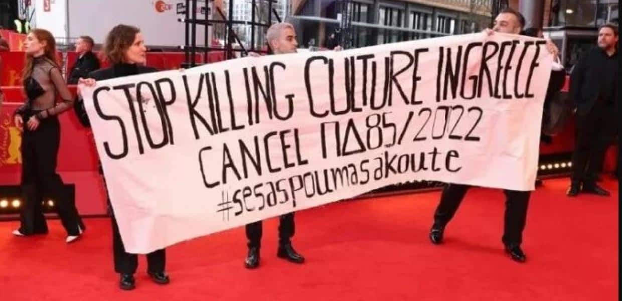 Συγκεκριμένα, στο πανό έγραφε «Stop killing culture in Greece» σε μία προσπάθεια να διαδοθεί και στην Ευρώπη το αίτημα των καλλιτεχνών για την απόσυρση του προεδρικού διατάγματος.
